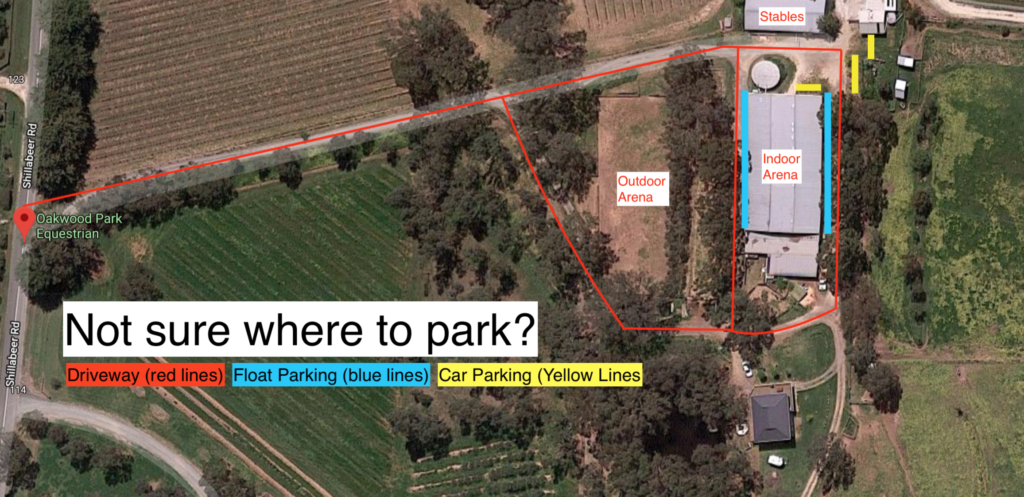 Below is a quick map of the property. Drive straight up the driveway towards the stables and you can park your float on either side of the arena. Please try to leave enough room for cars to get past.